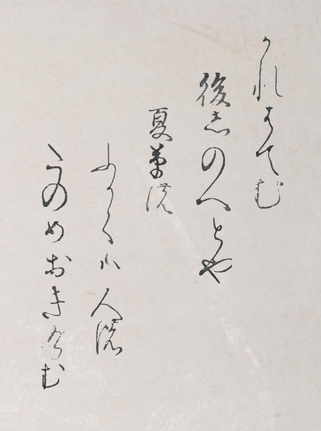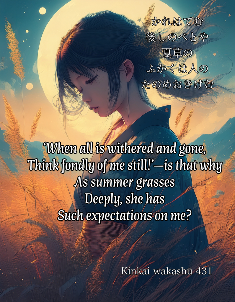 Kinkai wakashū Kinkai wakashū 431 13th December 2025 Thomas Leave a comment かれはてむ後しのべとや夏草のふかくは人のたのめおきけむ karehatemu nochi shinobe to ya natsukusa no fukaku wa hito no tanome okikemu‘When all is withered and gone, Think fondly of me still!’—is that why As summer grasses Deeply, she has Such expectations on me? 431