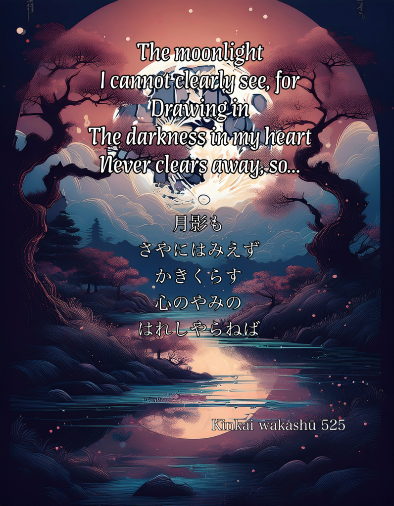 Kinkai wakashū Kinkai wakashū 524 19th March 2026 Thomas Leave a comment 月影もさやにはみえずかきくらす心のやみのはれしやらねば tsukikage mo saya ni wa miezu kakikurasu kokoro no yami no hareshi yaranebaThe moonlight I cannot clearly see, for Drawing in The darkness in my heart Never clears away, so… 524