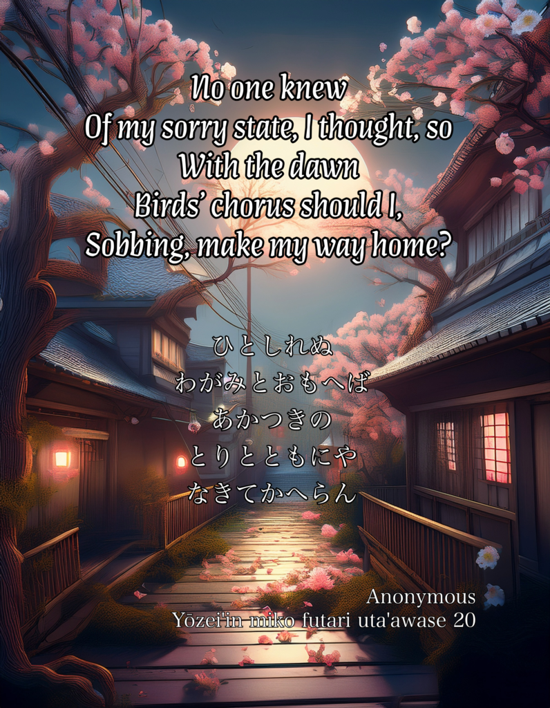 hito shirenu wa ga mi to omoeba akatsuki no tori to tomo ni ya nakite kaeran No one knew Of my sorry state, I thought, so With the dawn Birds’ chorus should I, Sobbing, make my way home?