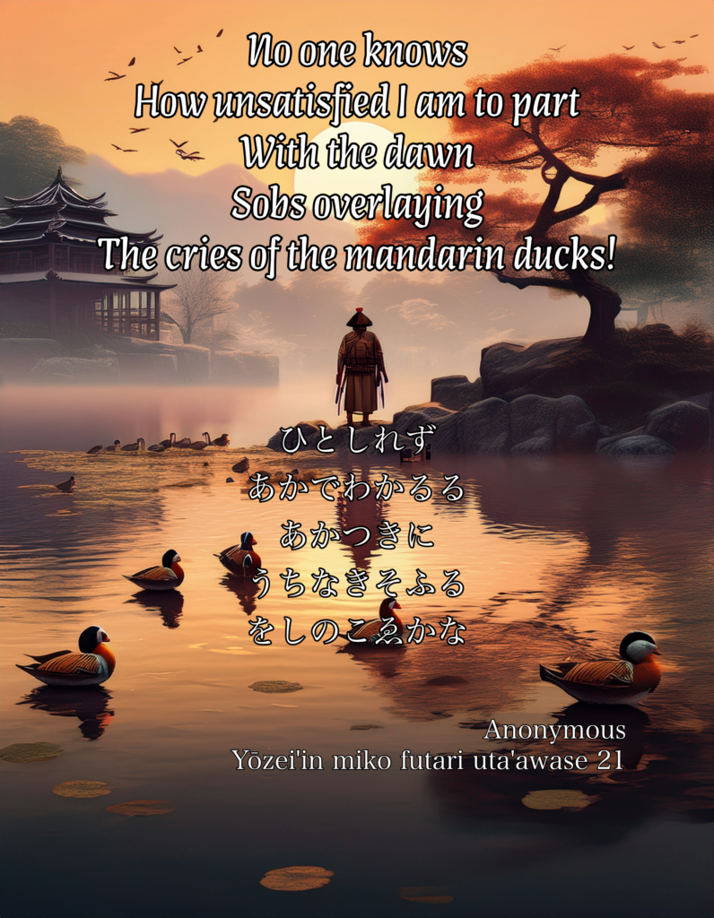 hito shirezu akade wakaruru akatsuki ni uchinaki souru oshi no koe kana No one knows How unsatisfied I am to part With the dawn Sobs overlaying The cries of the mandarin ducks!