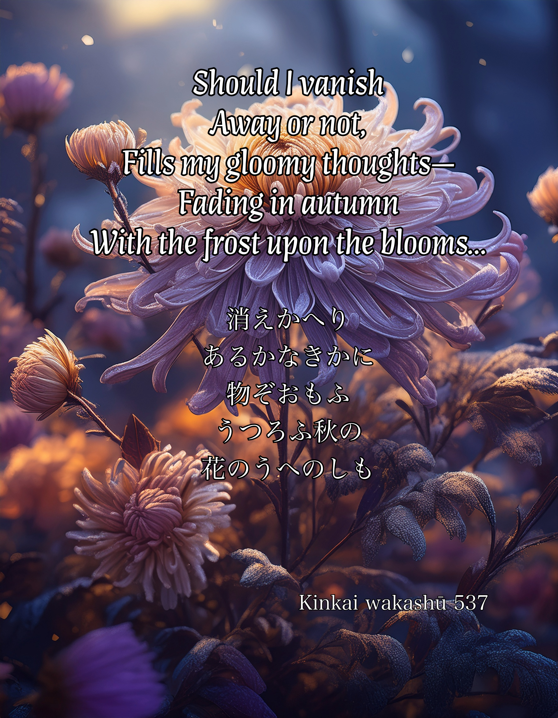 | kiekaeri aru ka naki ka ni mono zo omou utsurou aki no hana no ue no shimo | Should I vanish Away or not, Fills my gloomy thoughts— Fading in autumn With the frost upon the blooms… |
