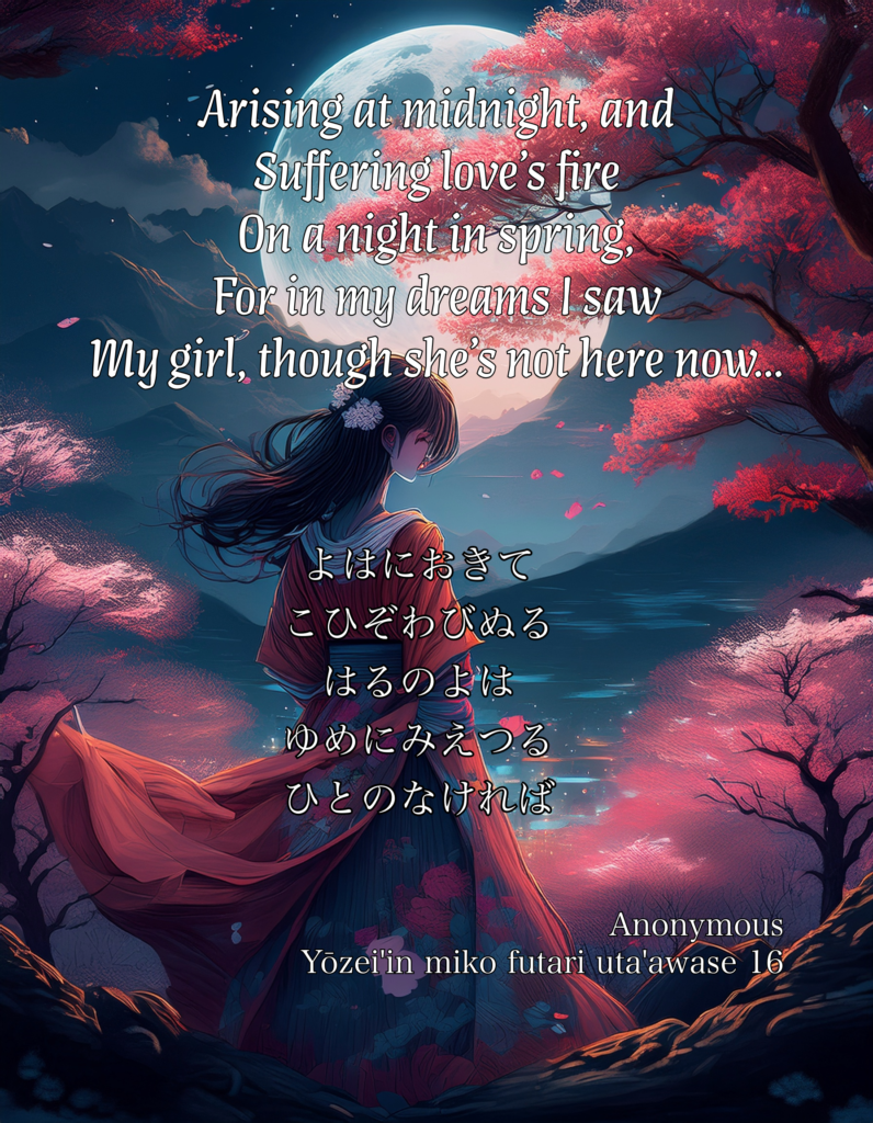 Toshiyori states: the first poem is one which appears to be incomprehensible to a particularly limitless extent. In the second poem, the ‘fine comb’ referred to is the one which Susanoo transformed Princess Inada and placed in his divine locks upon their first meeting. This poem has ‘I have seen her once’ and thus appears to have a conception that they have already met. The final section has ‘How would I wear her in my hair?’, which makes it seem that the comb has yet to be placed there. This appears to differ from the original tale. One could ask the poet whether he has mistaken this ancient tale—perhaps he has simply remembered it wrong? It’s not possible to decide upon a winner or loser.