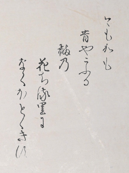 Mototoshi states: the expression ‘faded and lingering’ is difficult to distinguish. In addition, saying ‘Fallen upon [the flower’s] upper leaves, / Frost’ is a severe misjudgment. The poem of the Right has the tautology ‘with the dawn fall’ and then ‘every morning’. Clearly neither of these appears to win or lose, so I make this a tie.