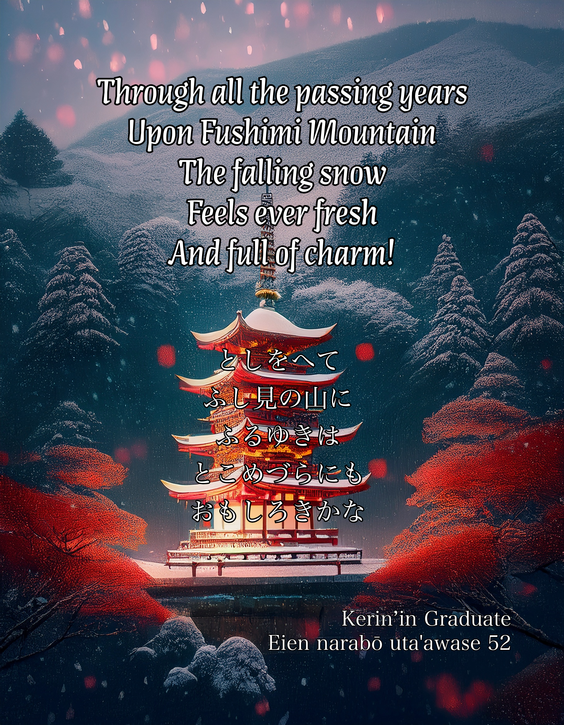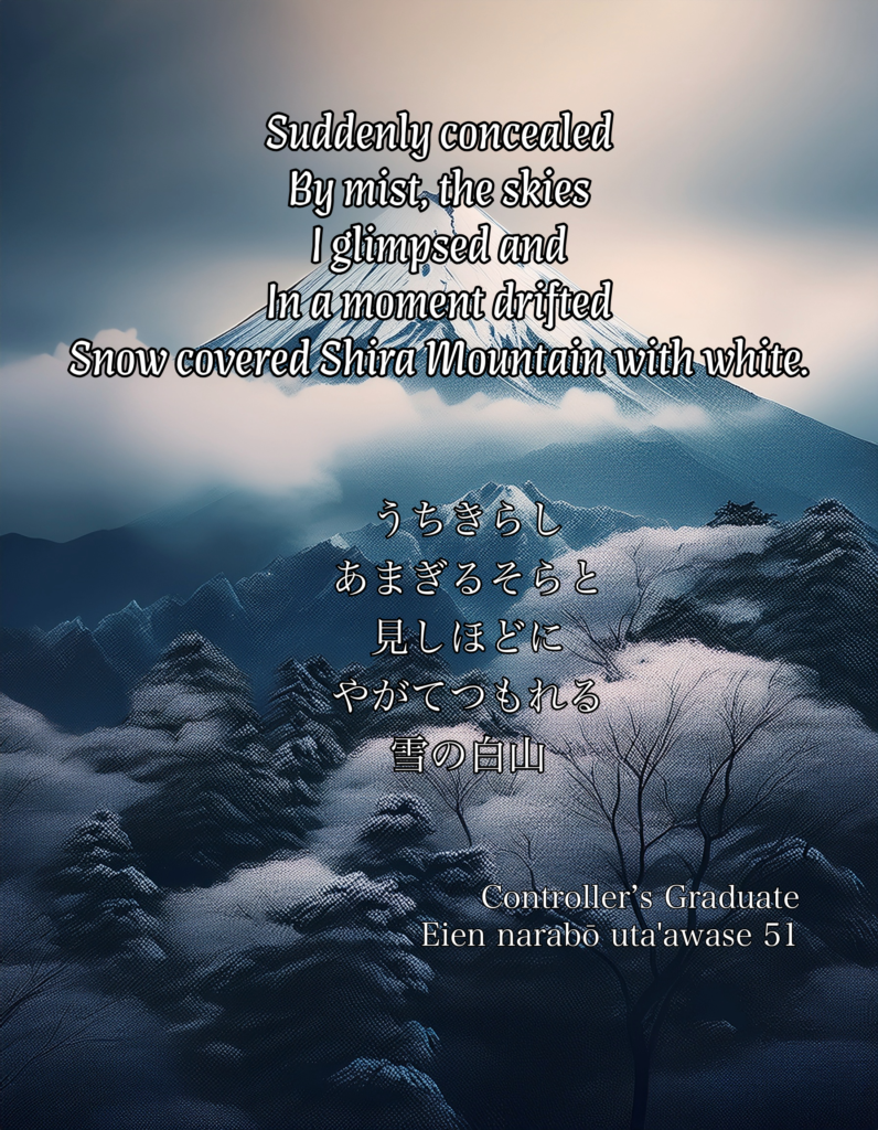 | kimi ga yo wa tsukiji to zo omou haru no hi no mikasa no yama ni sasamu kagiri wa | My Lord’s reign Will never fade, I feel! While in spring the sun Upon Mikasa Mountain Shines down… |
