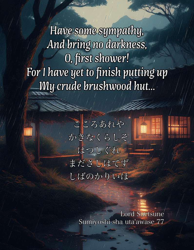 kokoro are ya kaki na kurashi so hatsushigure mada sashihatezu shiba no kari’io | Have some sympathy, And bring no darkness, O, first shower! For I have yet to finish putting up My crude brushwood hut… |