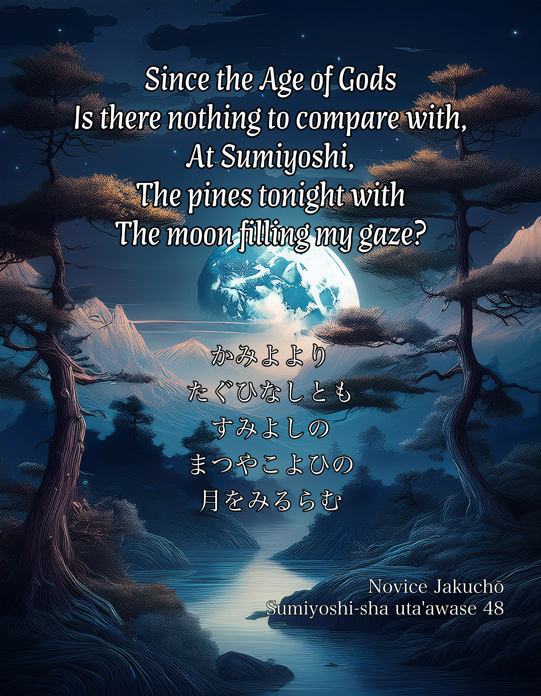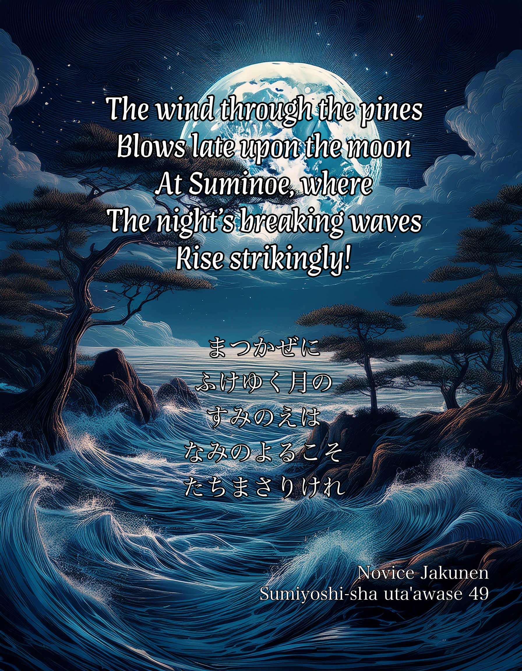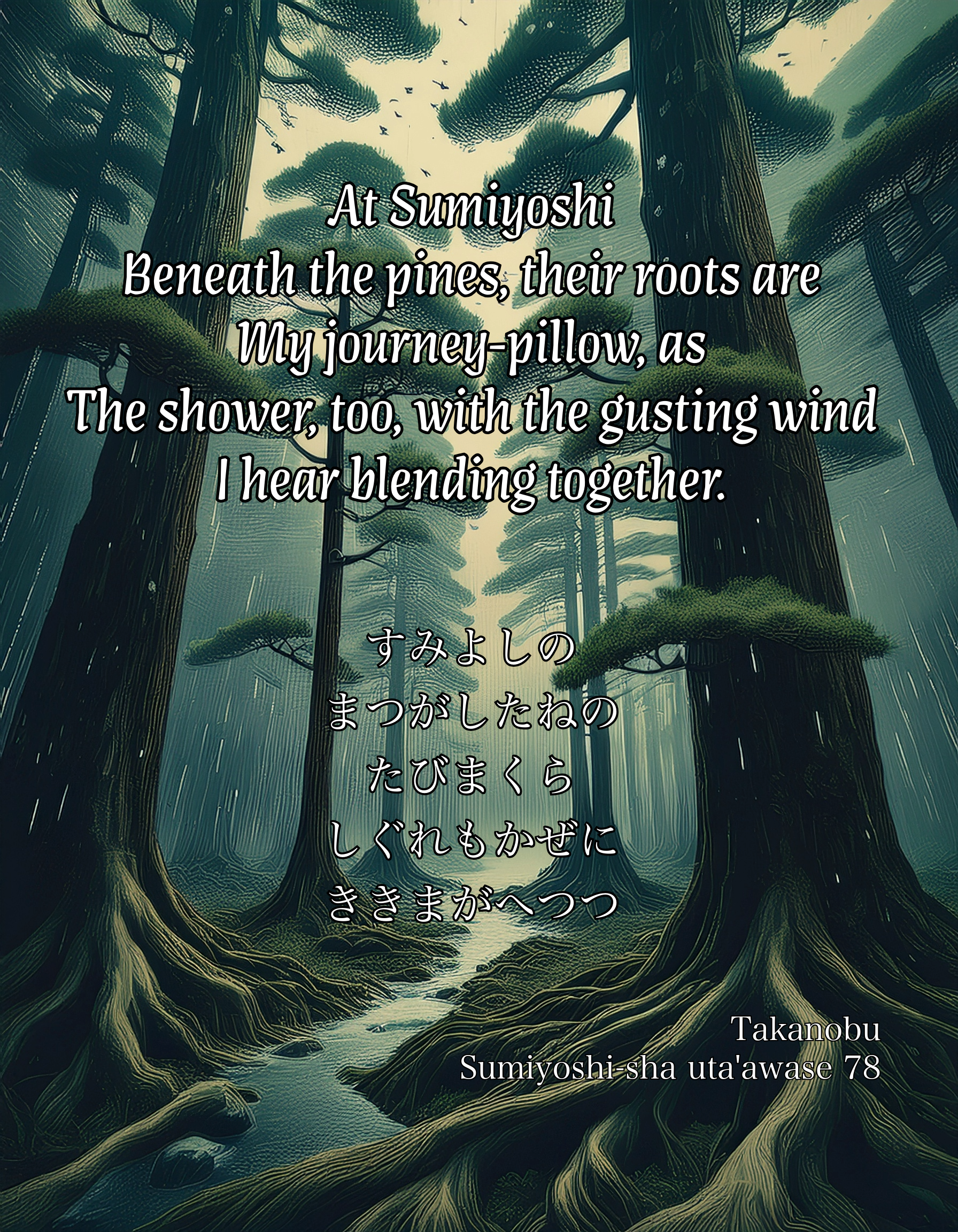 sumiyoshi no matsu ga shita ne no tabimakura shigure mo kaze ni kikimagaetsutsu | At Sumiyoshi Beneath the pines, their roots are My journey-pillow, as The shower, too, with the gusting wind I hear blending together. |