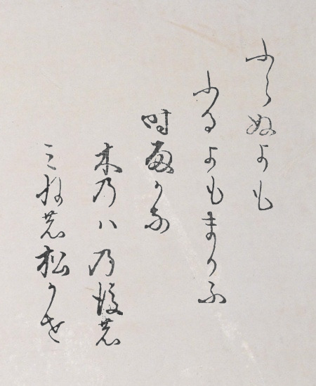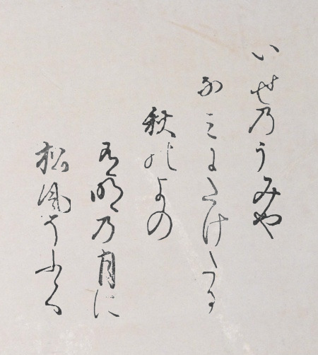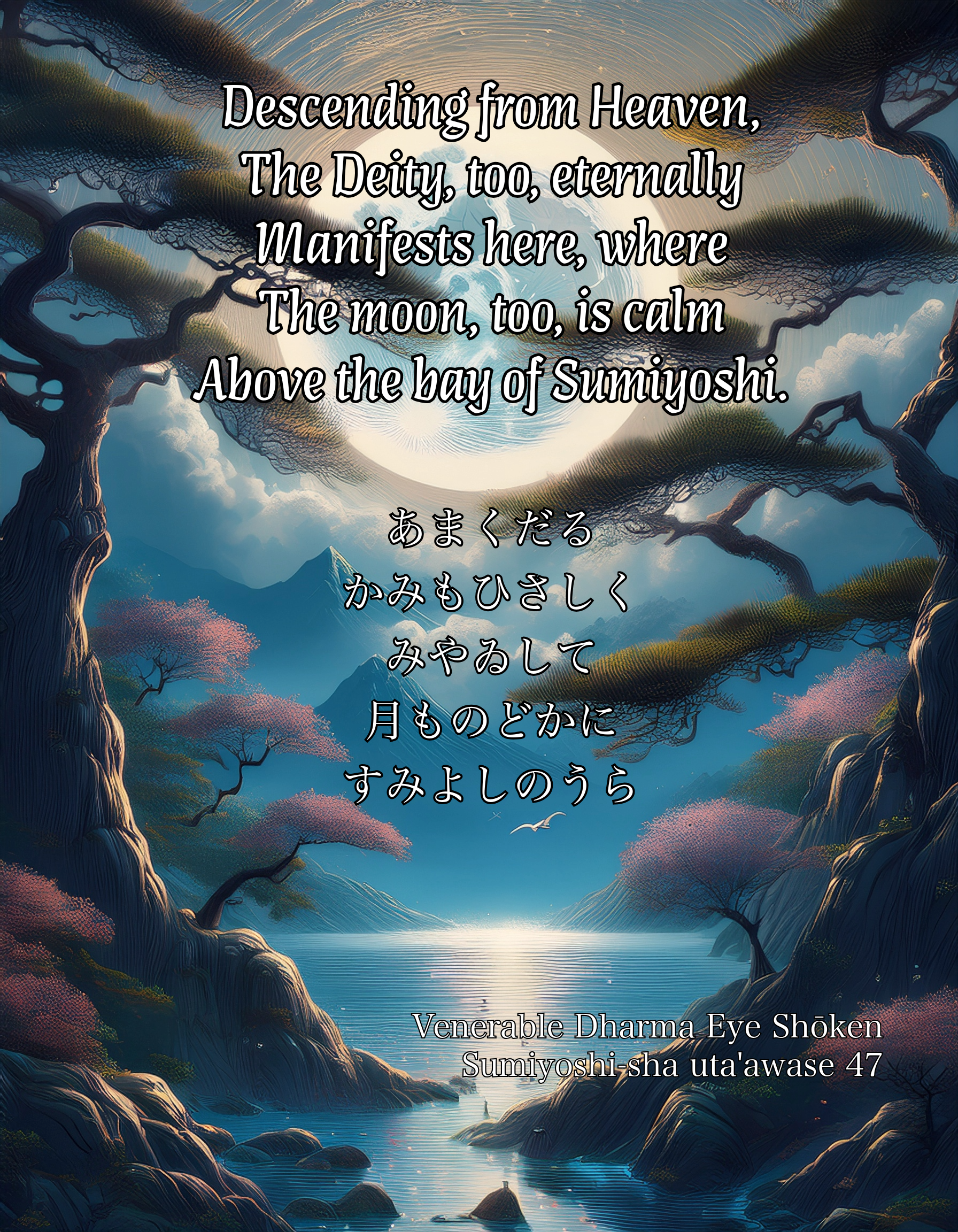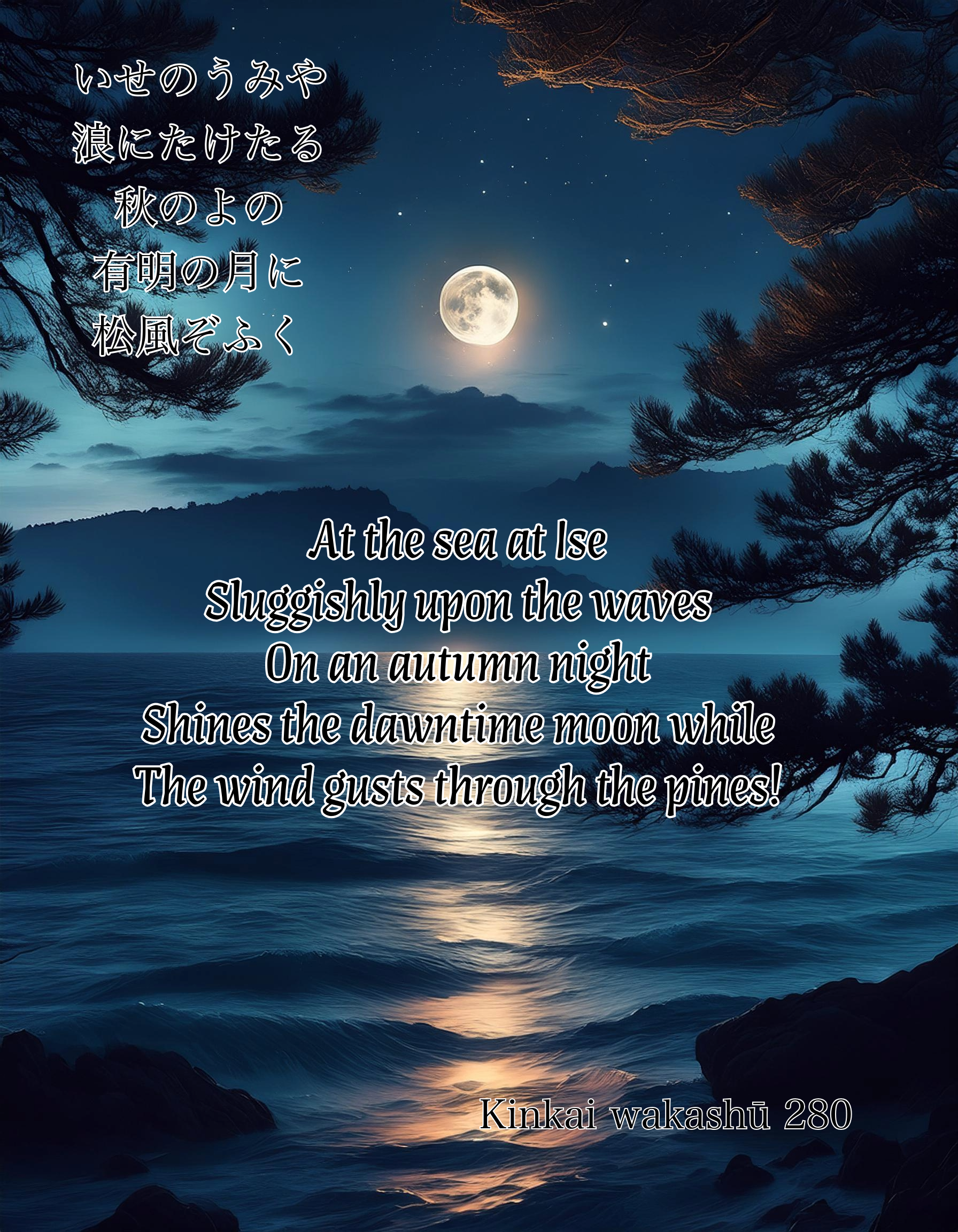 sumiyoshi no matsu ga shita ne no tabimakura shigure mo kaze ni kikimagaetsutsu | At Sumiyoshi Beneath the pines, their roots are My journey-pillow, as The shower, too, with the gusting wind I hear blending together. |