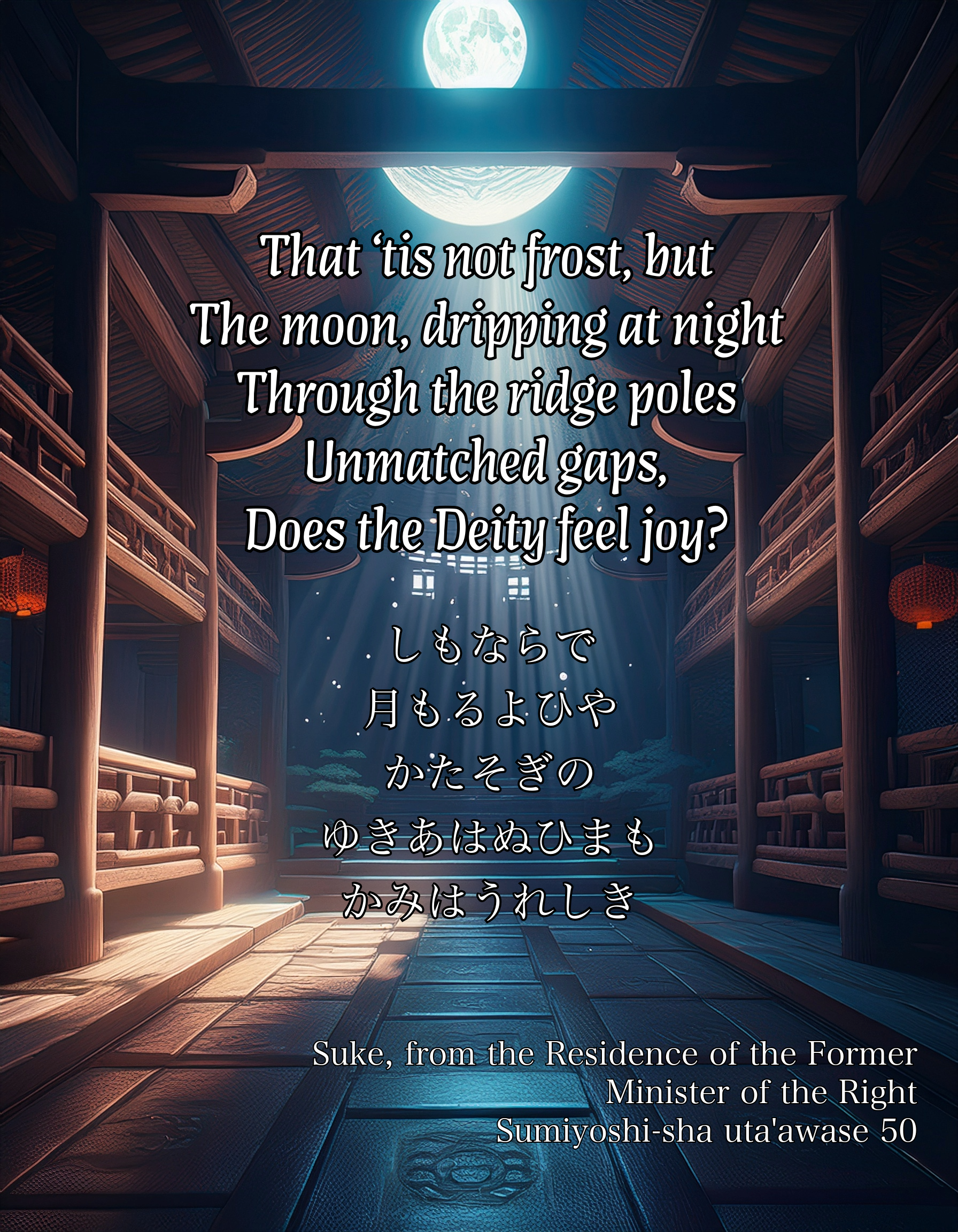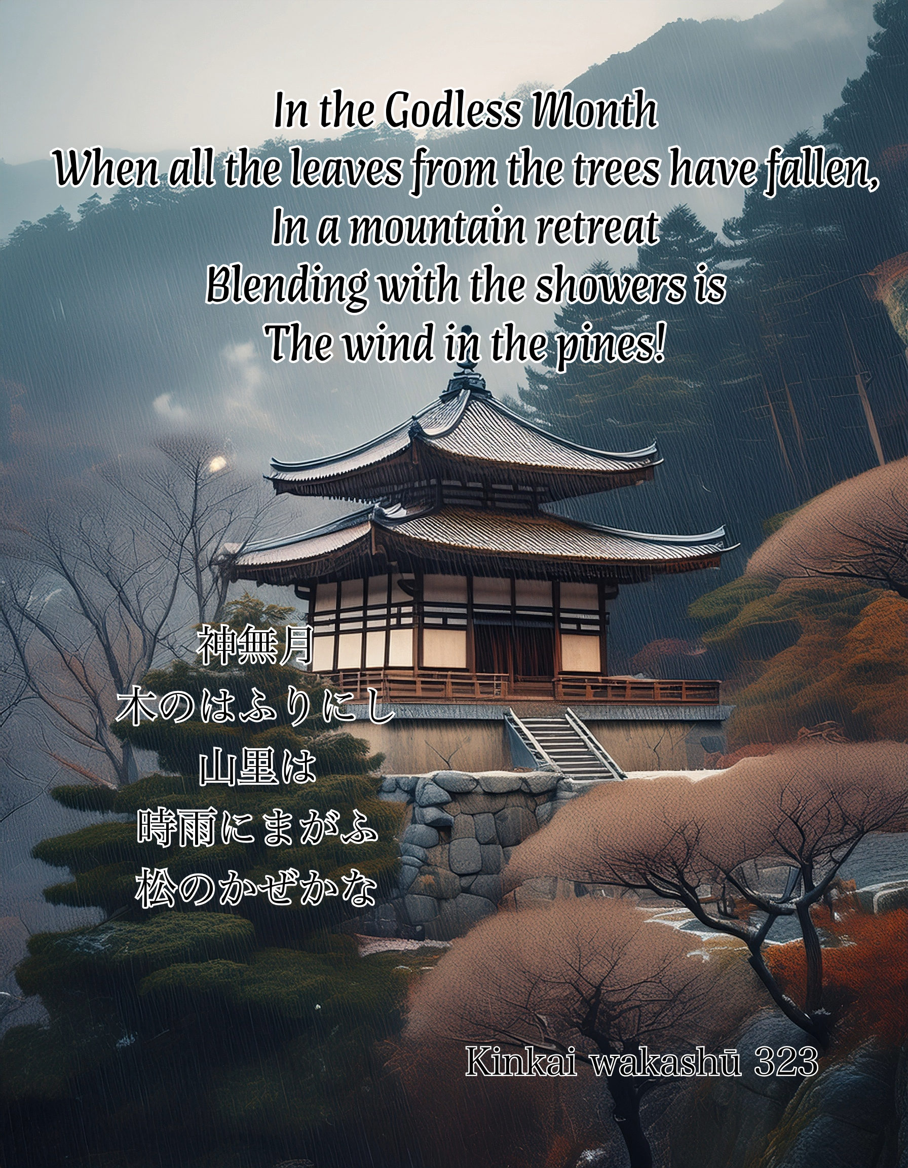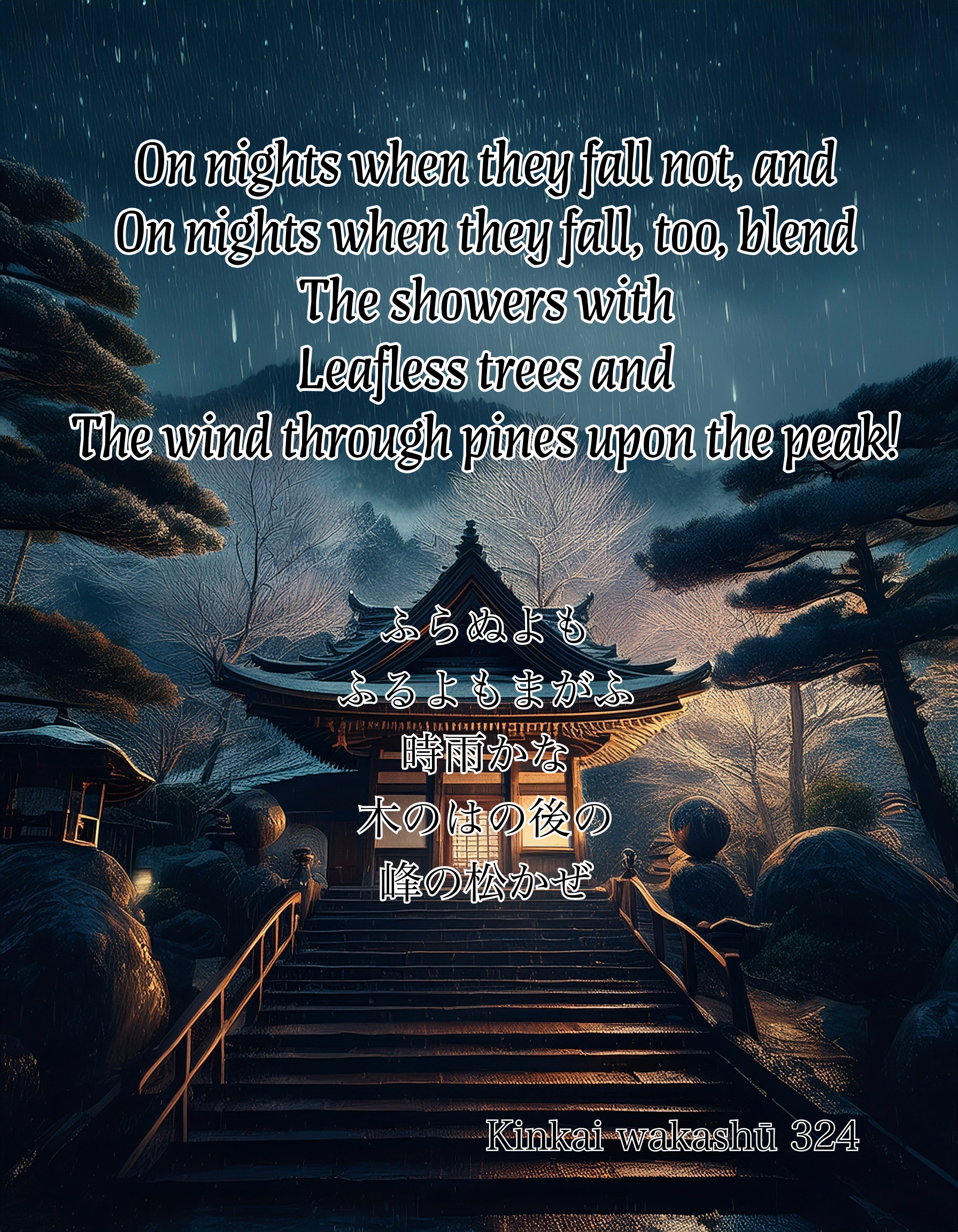 kokoro are ya kaki na kurashi so hatsushigure mada sashihatezu shiba no kari’io | Have some sympathy, And bring no darkness, O, first shower! For I have yet to finish putting up My crude brushwood hut… |