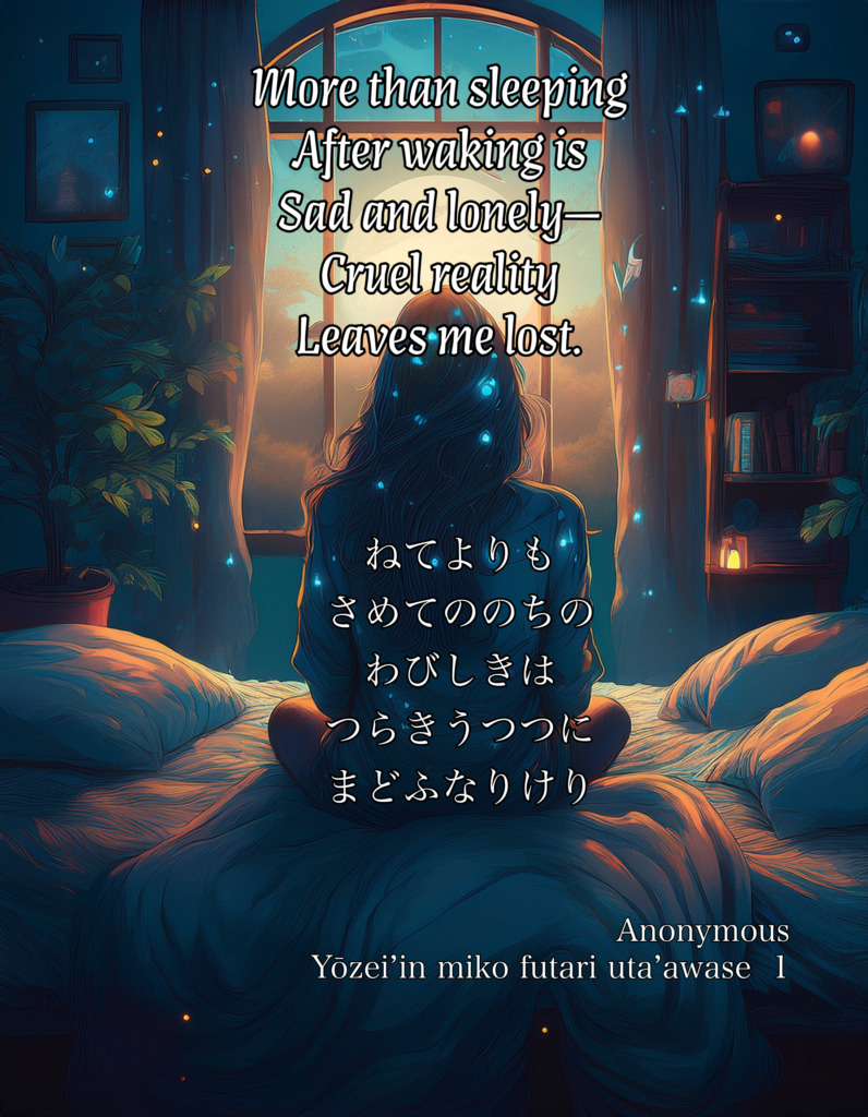 nete yori mo samete no nochi no wabishiki wa tsuraki utsutsu ni madou narikeri More than sleeping After waking is Sad and lonely— Cruel reality Leaves me lost.