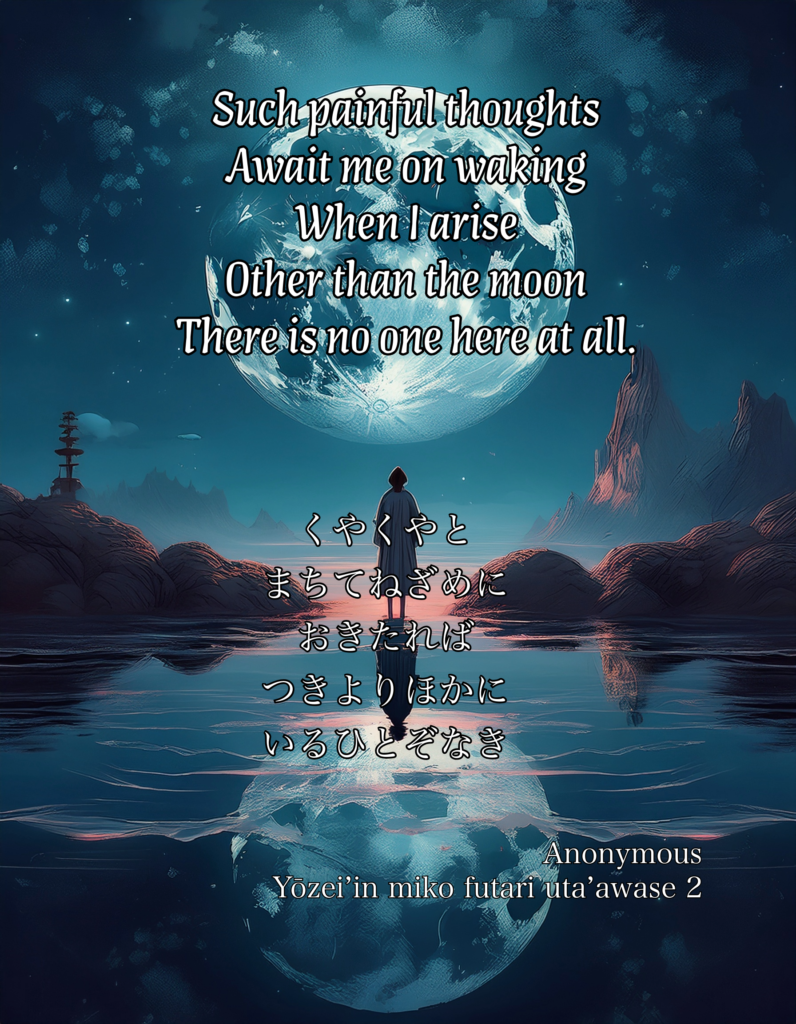 kuyakuya to machite nezame ni okitareba tsuki yori hoka ni iru hito zo naki Such painful thoughts Await me on waking When I arise Other than the moon There is no one here at all.
