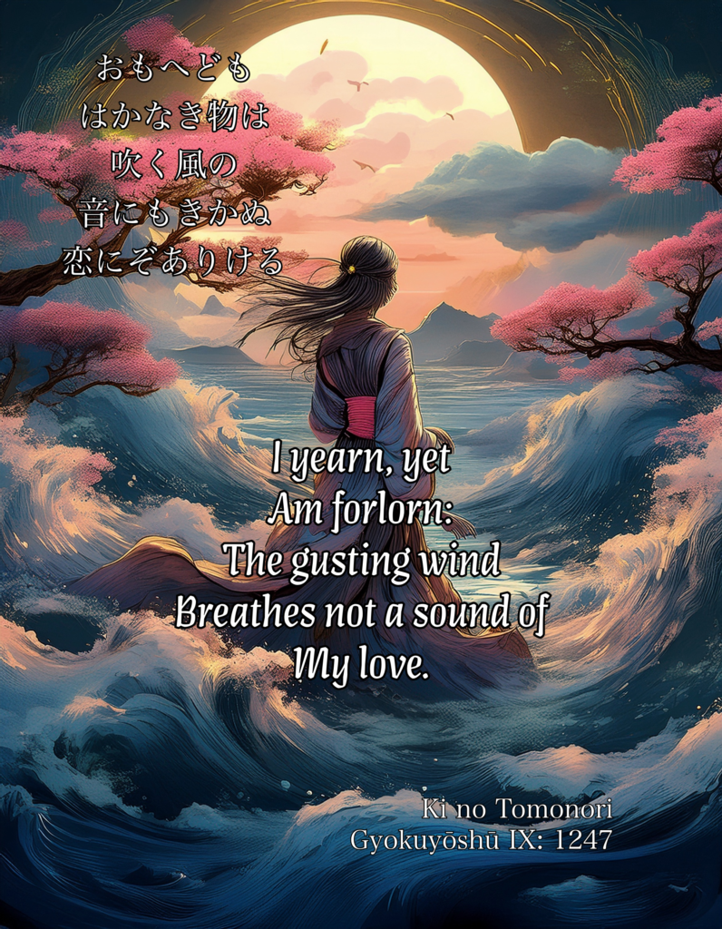 [1] This is a quotation from: Topic unknown. すがるなく秋のはぎはらあさたちて旅行く人をいつとかまたむ sugaru naku / aki no hagiwara / asa tachite / tabi yuku hito o / itsu to ka matan ‘Mud-daubers buzzing / In the autumn bush clover; / Leaving with morning, / Away on a journey: for him, / How long must I wait?’ Anonymous (KKS VIII: 366)
