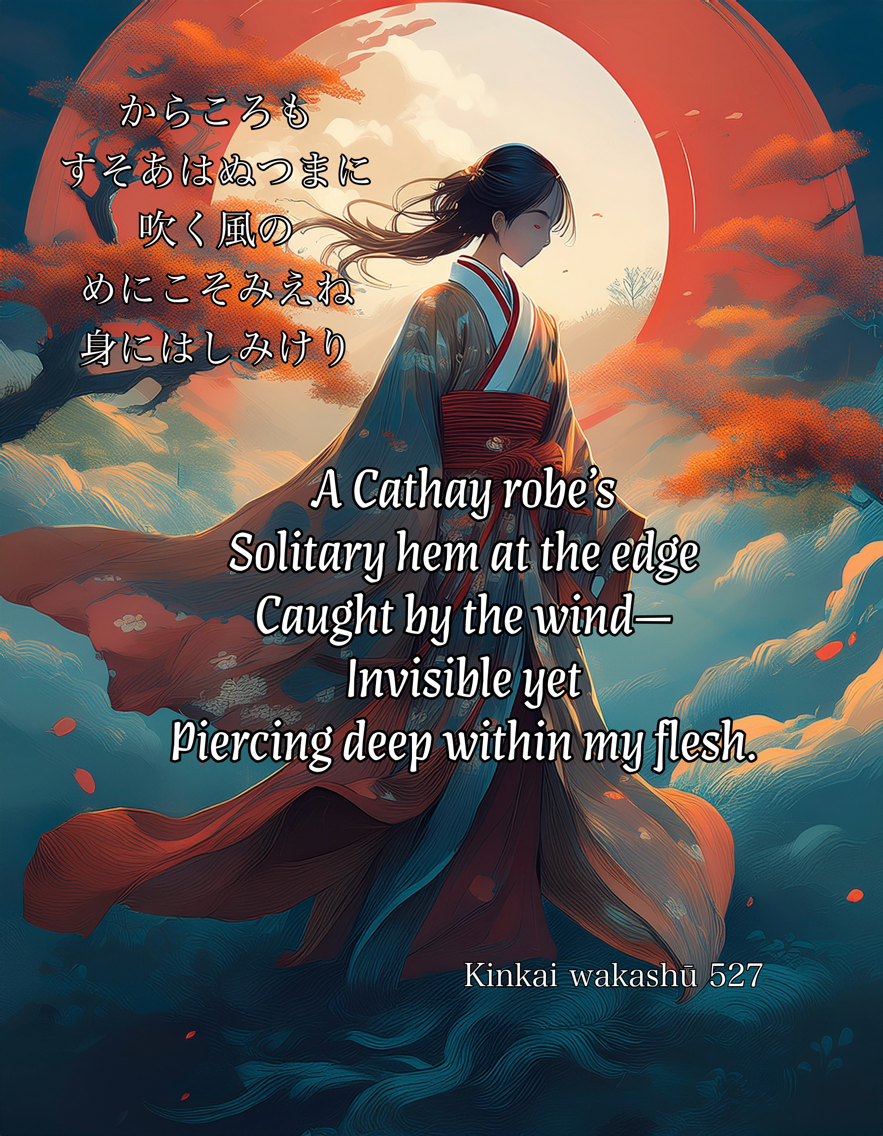 As the autumn night Wears on, the wind Clears away the cloud, and From the pale indigo sky Comes clear moonlight.
