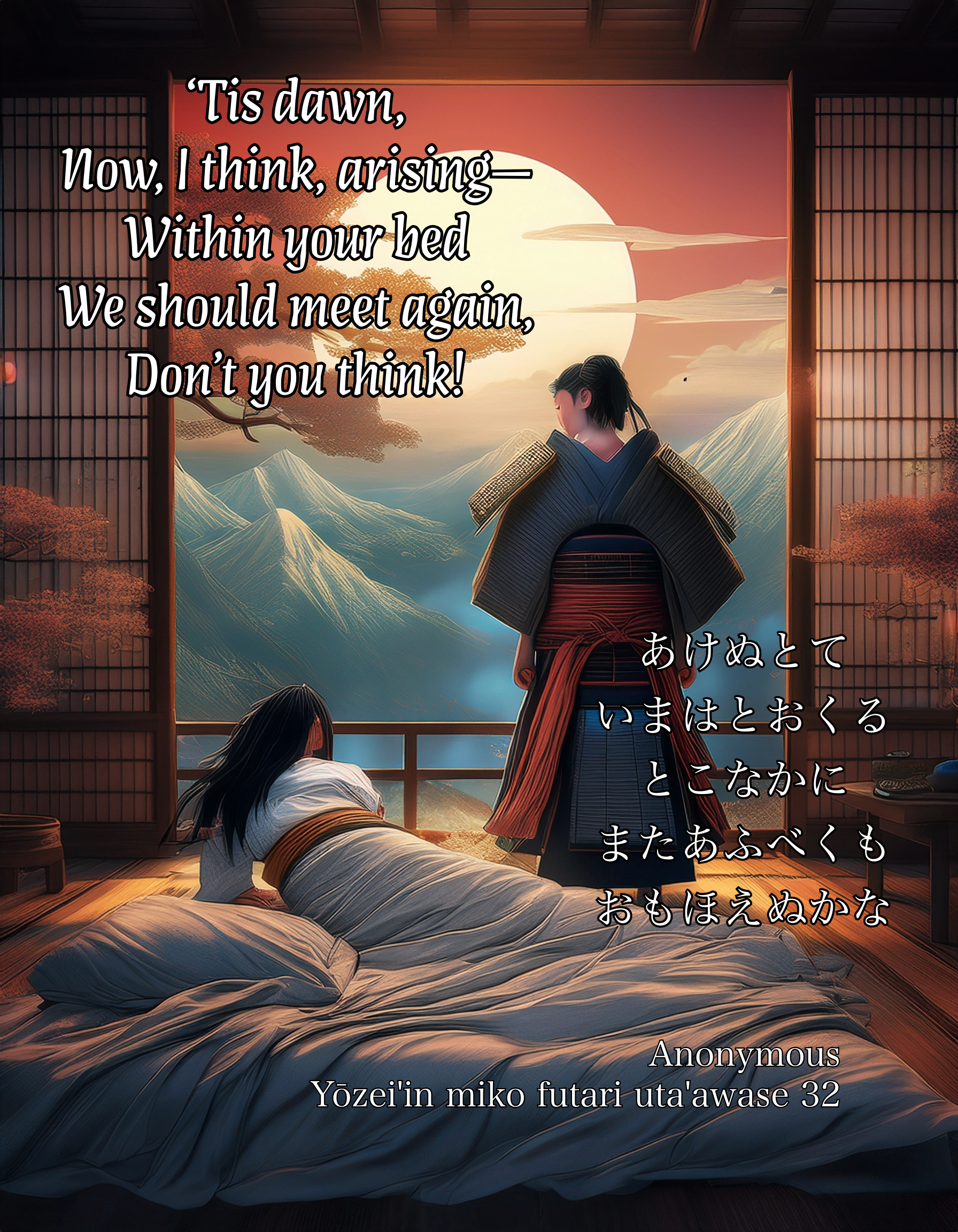 | akenu tote ima wa to okuru toko naka ni mata aubeku mo omohoenu kana | ‘Tis dawn, Now, I think, arising— Within your bed We should meet again, Don’t you think! |