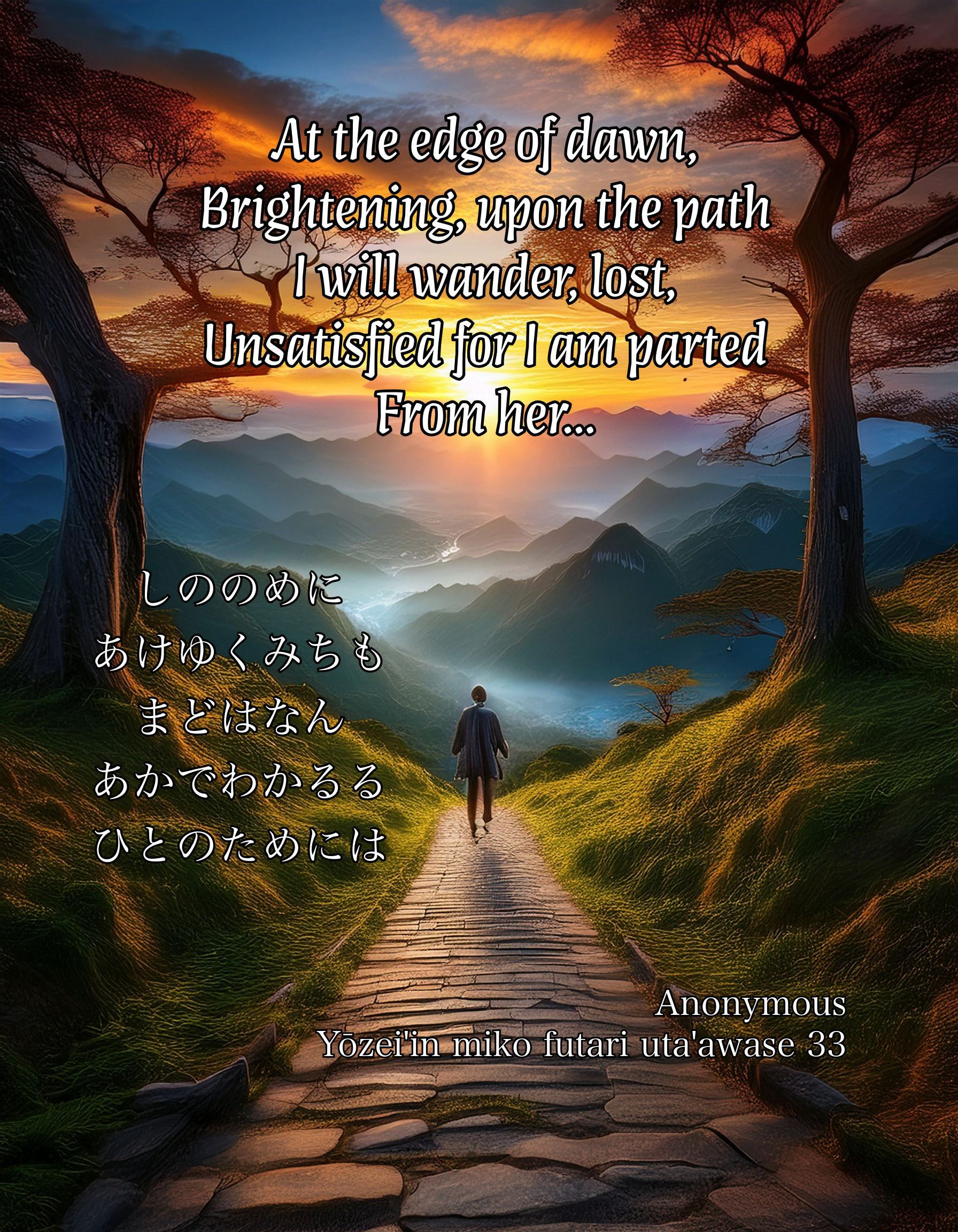 | shinonome ni akeyuku michi mo madowanan akade wakaruru hito no tame ni wa | At the edge of dawn, Brightening, upon the path I will wander, lost, Unsatisfied for I am parted From her… |