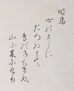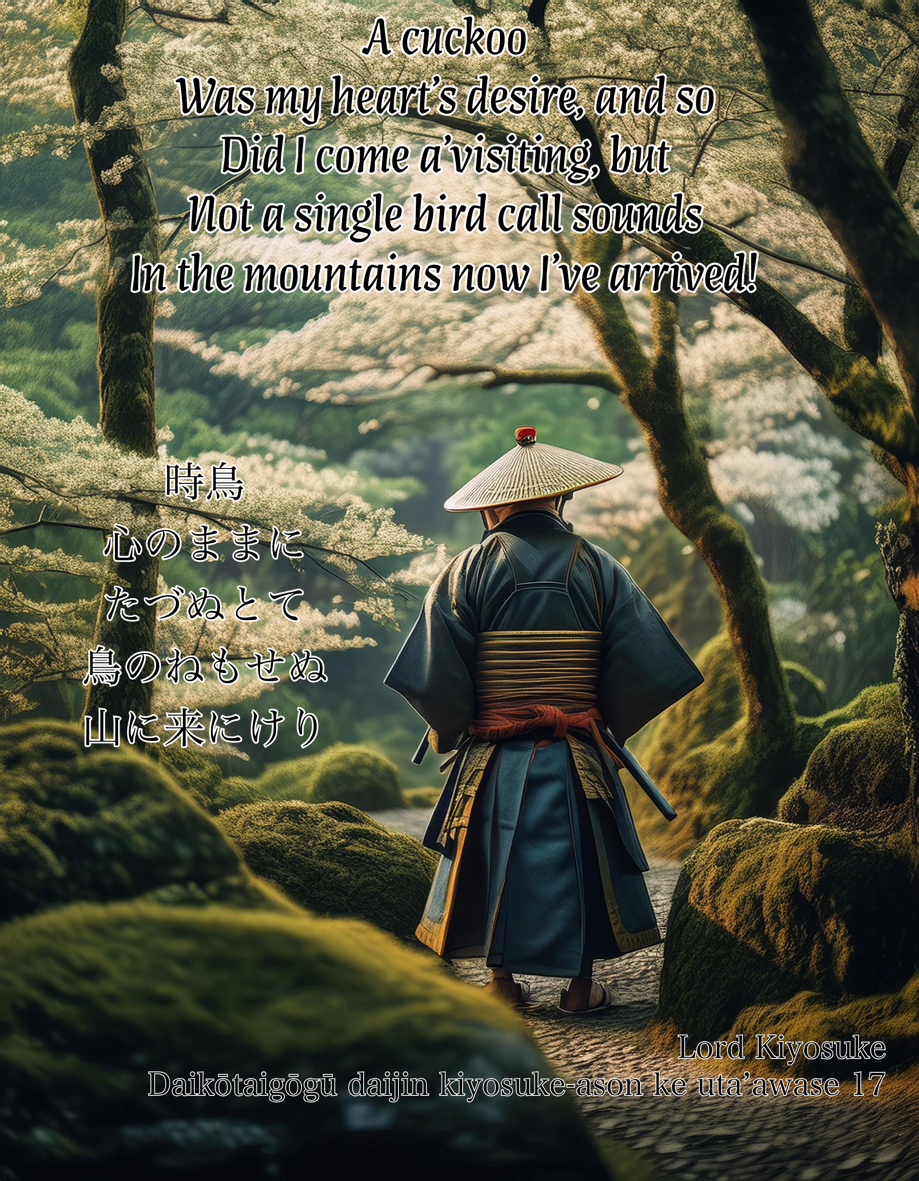 | hototogisu kokoro no mama ni tazunu tote tori no ne mo senu yama ni kinikeri | A cuckoo Was my heart’s desire, and so Did I come a’visiting, but Not a single bird call sounds In the mountains now I’ve arrived! |
