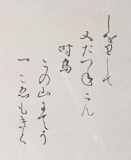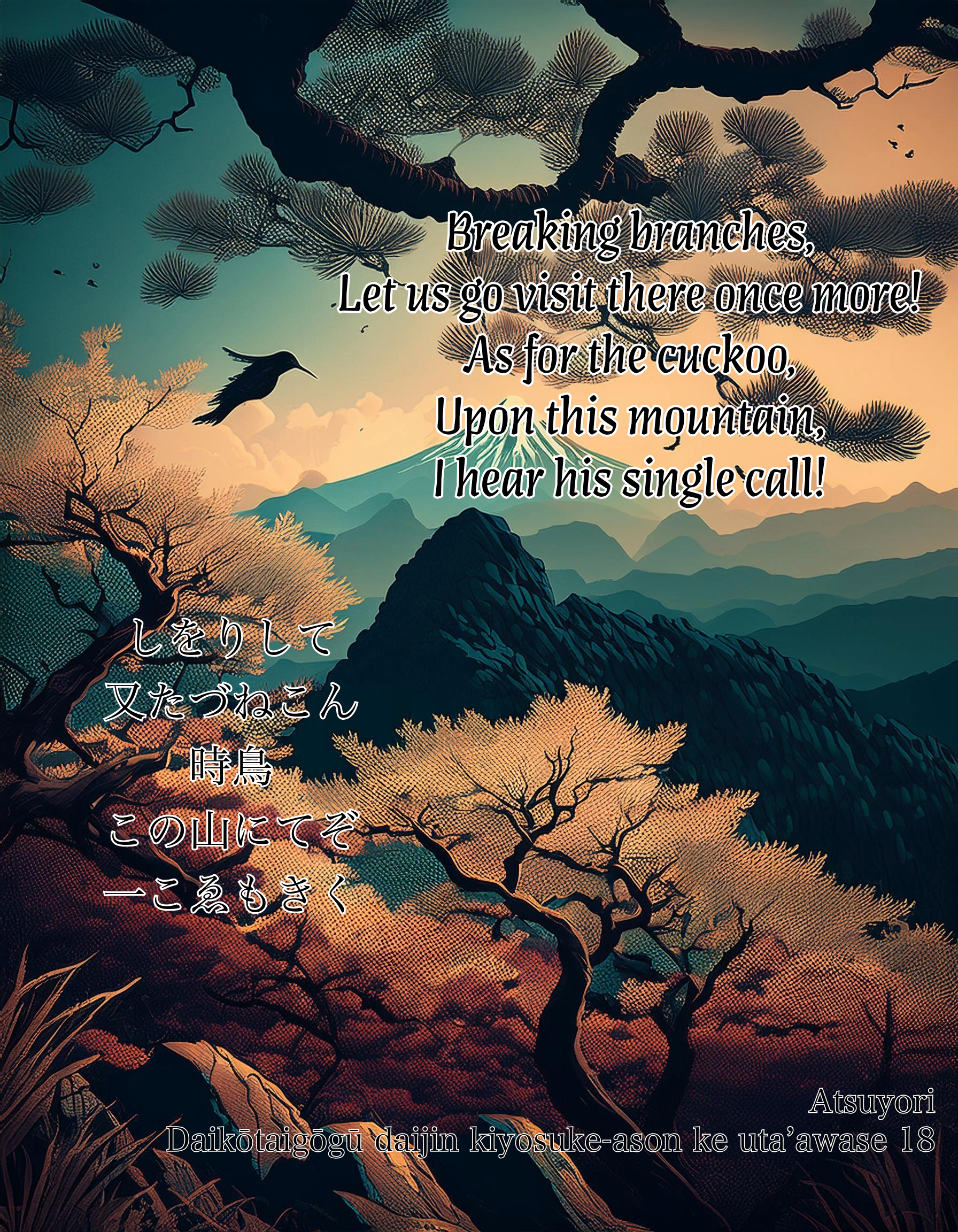 | shiorishite mata tazunekon hototogisu kono yama nite zo hitogoe mo kiku | Breaking branches, Let us go visit there once more! As for the cuckoo, Upon this mountain, I hear his single call! |