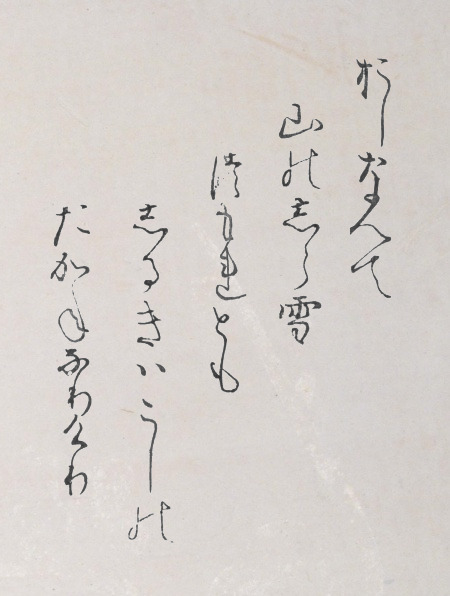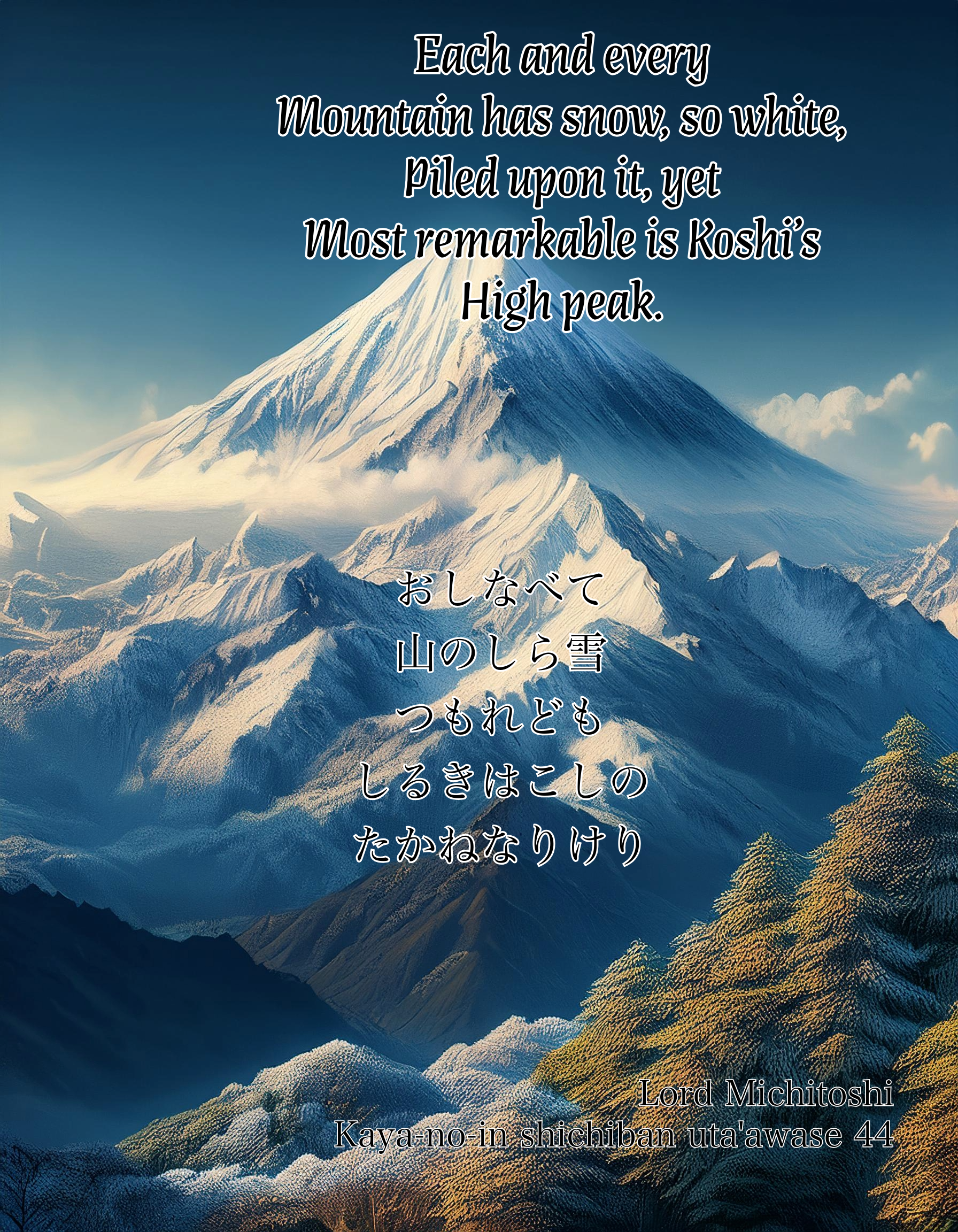 | oshinabete yama no shirayuki tsumoredomo shiruki wa koshi no takane narikeri | Each and every Mountain has snow, so white, Piled upon it, yet Most remarkable is Koshi’s High peak. |