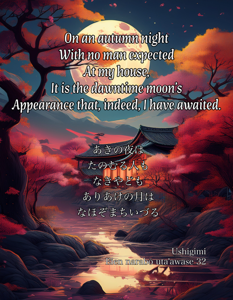 | aki no yo no kumo fuki’harau arashi koso tsuki miru hito no kokoro narikere | On an autumn night The clouds a’blowing away, The storm wind, truly, As someone gazing upon the moon Has the selfsame heart! |