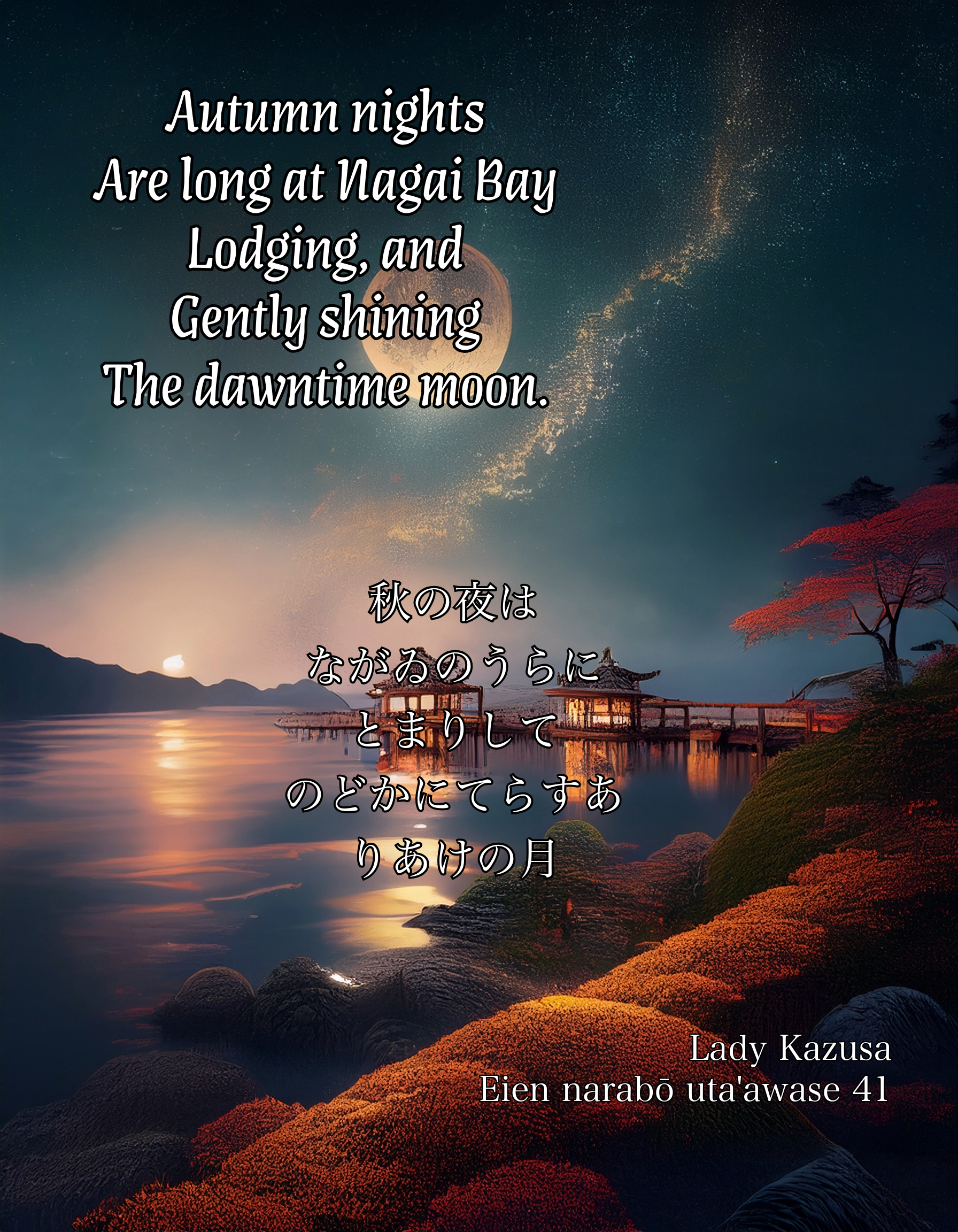 | aki no yo wa nagai no ura ni tomarishite nodoka ni terasu ariake no tsuki | Autumn nights Are long at Nagai Bay Lodging, and Gently shining The dawntime moon. |