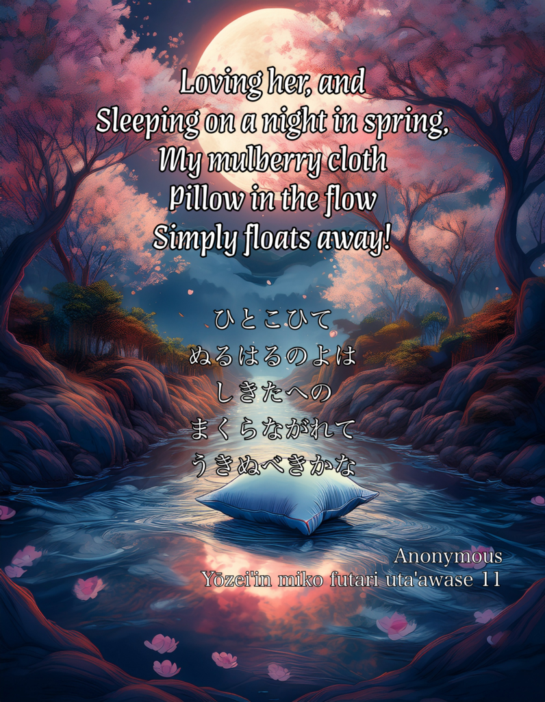 [1] Alluding to: Topic unknown. よひよひに枕さだめむ方もなしいかにねし夜か夢に見えけむ yoi yoi ni / makura sadamemu / kata mo nashi / ika ni neshi yo ka / yume ni miekemu ‘Night after night / To decide upon my pillow / I cannot do, at all / How can I sleep the night away / And see you in my dreams?’ Anonymous (KKS XI: 516)