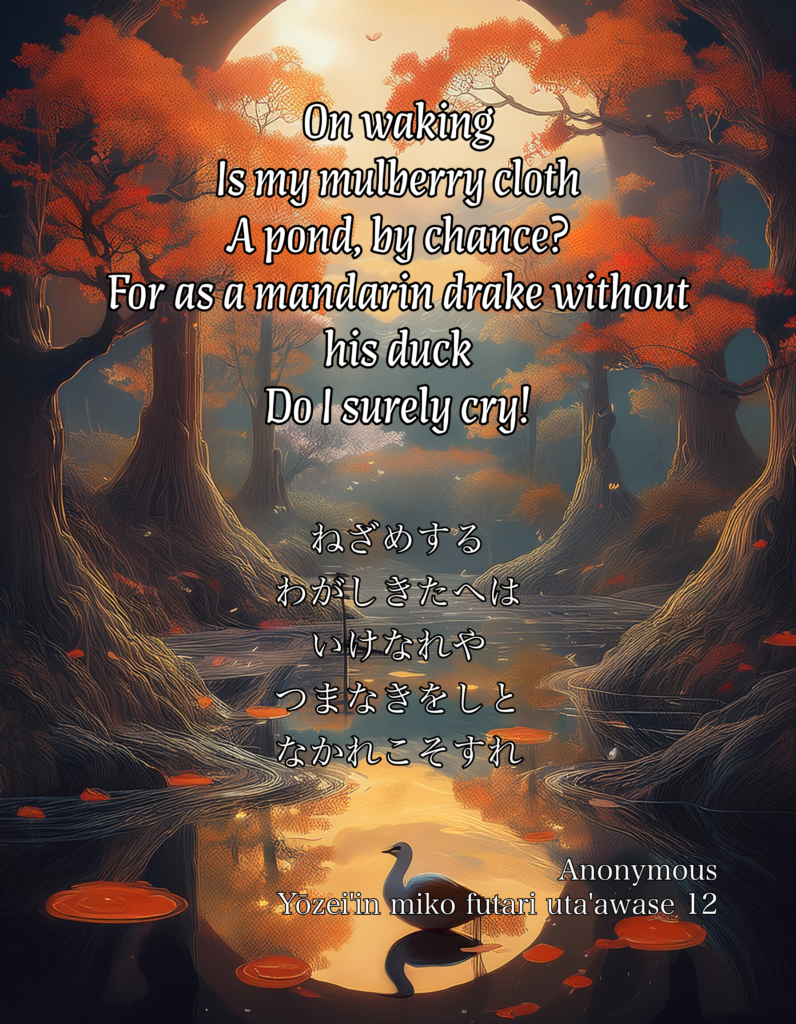 The Left’s poem is not bad in configuration and diction, but I would have preferred it had it said ‘no drips fall from the showers, too, yet’. As for the Right, saying that one is napping on one’s travels on the coast at Sumiyoshi, having woven a pillow from forgetful day-lilies does, indeed, sound evocative, but it would have been more so had there been a reason for the reference to day-lilies earlier in the poem. These tie, don’t they.