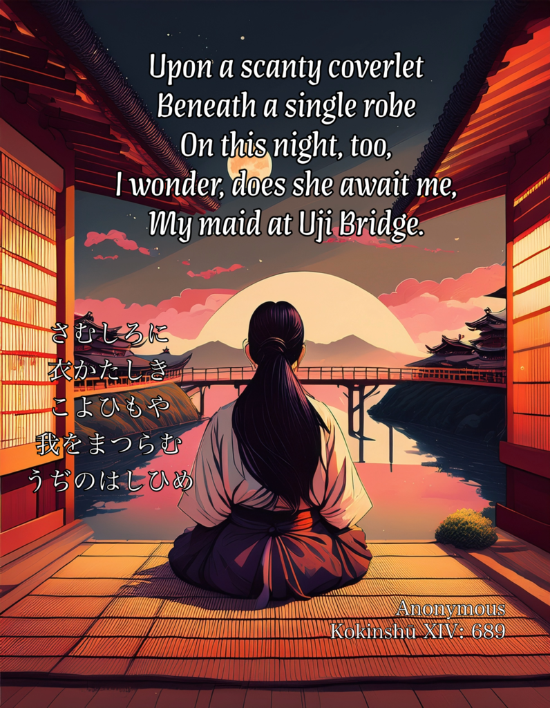 | Upon a scanty coverlet Beneath a single robe On this night, too, I wonder, does she await me, My maid at Uji Bridge.